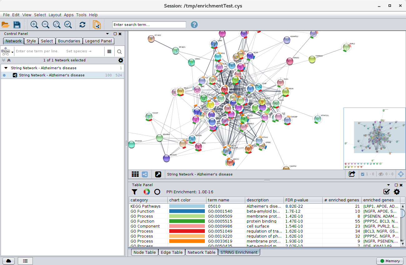 In addition, stringApp can retrieve functional enrichment for Gene Ontology terms, KEGG, Reactome and Wiki Pathways, DISEASES, COMPARTMENTS, TISSUES, and protein domains at a user-specified significance threshold and show the results in a new table in the Table Panel. It is also possible to perform the enrichment analysis automatically for several groups of nodes such as resulting from clustering. For visualization of the enrichment results, the app provides different types of charts to show the enriched terms. Note that you need to install the enhancedGraphics app for the charts to show.